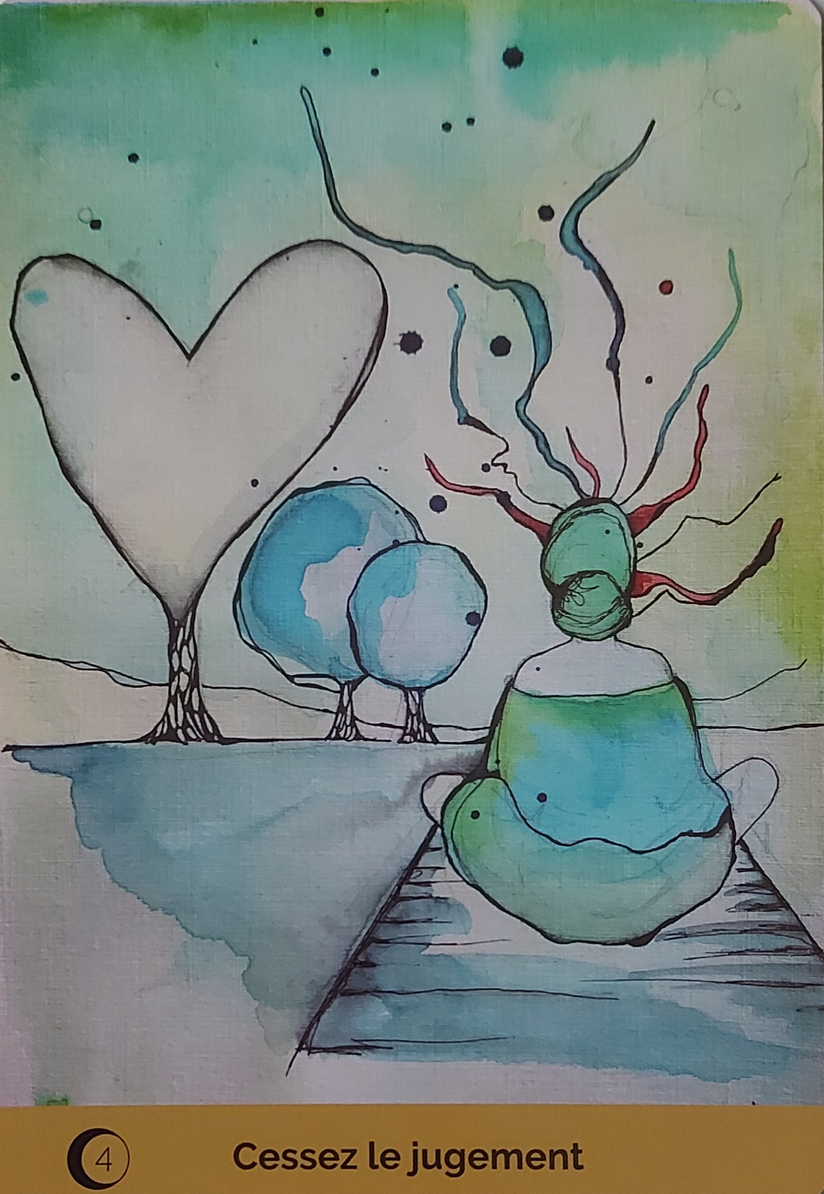 Tu es invité·e à observer ta façon de regarder l'autre et ton besoin de valorisation dans tes liens. Te sens-tu obligé·e de te comparer à l'autre ? Te sens-tu inconfortable face à ce que l'autre fait différemment de toi ? Lorsque tu te permets de commenter la réalité de l'autre, tu empiètes sur un terrain où tu peux facilement sortir de l'amour. Derrière cela se dissimule le jugement que tu t'imposes à toi-même. T'accordes tu le droit de te tromper, de respirer, de ne pas toujours avoir l'air parfait·e ? Trop de rigidités.